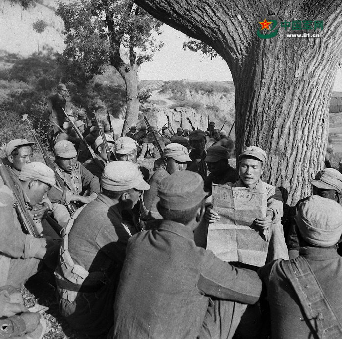 八路军某部官兵利用休息时间读报学习,提高思想觉悟。邹健东摄