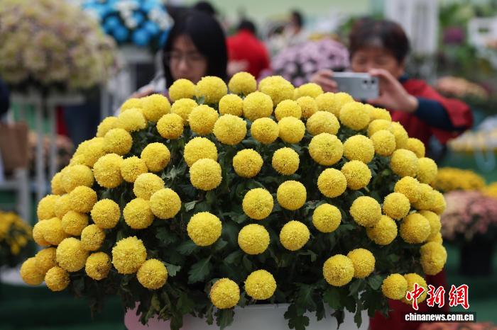 10月26日,南京农业大学湖熟菊花基地内,市民与菊花景观合影。中新社记者 泱波 摄