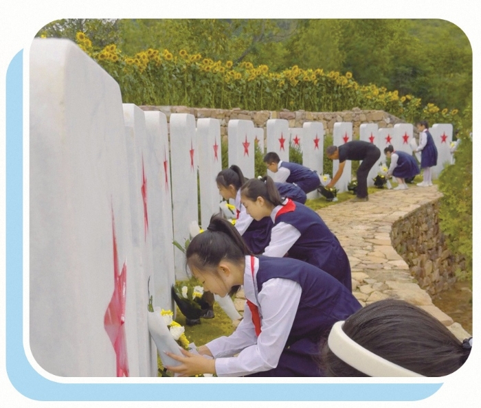 当地小学生向新落成的烈士墓献花。章德辉摄
