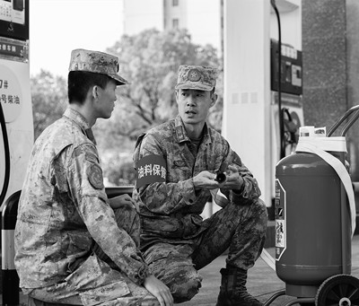 近日,东部战区陆军某旅依规开展消防安全检查。图为战士正在学习了解大型灭火器使用方法。周俊聿摄