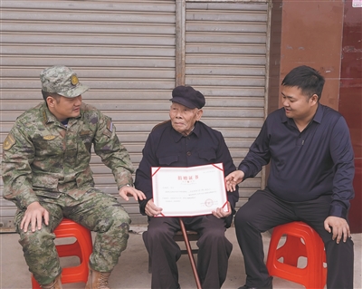 工作人员为抗美援朝老兵徐期判送上捐赠证书。祁东县人武部供图