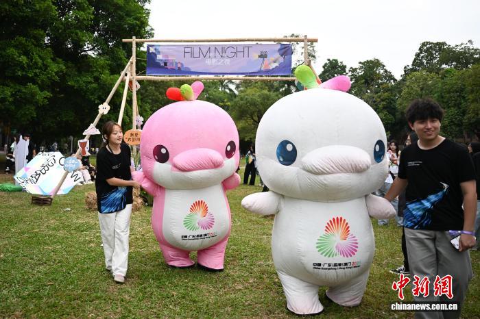 11月1日,第3届粤港澳大湾区大学生电影周暨第21届广州大学生电影展“晚风FUN映”电影之夜在位于广州市的华南农业大学举办。图为活动现场的十五运会和残特奥会吉祥物“喜洋洋”“乐融融”。中新社记者 陈楚红 摄