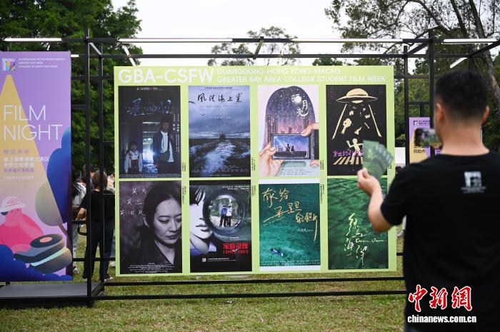 11月1日,第3届粤港澳大湾区大学生电影周暨第21届广州大学生电影展“晚风FUN映”电影之夜在位于广州市的华南农业大学举办。图为影片海报吸引参观者拍照。中新社记者 陈楚红 摄