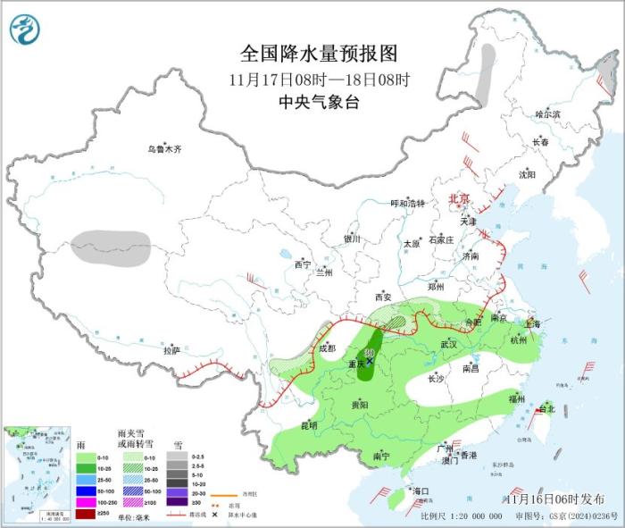 11月16日8时至17日8时,内蒙古东北部、东北地区东部和北部、西北地区东南部、陕西中南部、黄淮西部、江汉西部、川西高原北部、重庆北部等地部分地区有小到中雪或雨夹雪,其中,陕西南部、重庆北部、河南西部、川西高原北部等地部分地区有大雪,秦岭及大巴山局地有暴雪或大暴雪(20~22毫米),新增积雪深度6~12厘米,局地可超过15厘米;黄淮西部、江淮西部、江汉中西部、西南地区东部、海南岛等地部分地区有小到中雨,其中,陕西东南部、四川东北部、重庆西北部等地部分地区有大雨(25~40毫米)。新疆东部和北部、青海东北部和西南部、内蒙古中东部、黑龙江东部、华北北部和东部、黄淮西部、江淮、江汉等地的部分地区有5~6级风、阵风7~9级;渤海、渤海海峡、黄海大部、东海西部、台湾海峡、巴士海峡、南海北部和中部、北部湾偏南海域将有7~8级风、阵风9~10级。