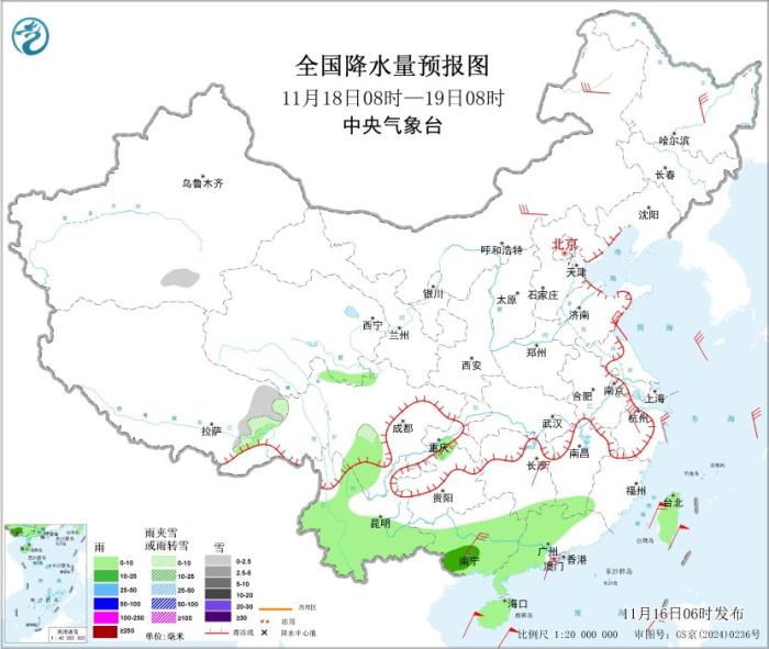 11月18日8时至19日8时,新疆东南部、西藏东部等地部分地区有小雪或雨夹雪;西南地区南部、华南大部、台湾岛等地部分地区有小雨,其中,广西西南部等地局地有中雨。内蒙古中东部、黑龙江东北部、湖南中部、浙江北部、广西西南部等地部分地区有5~6级风;东海大部、台湾海峡、巴士海峡、南海北部和中部、北部湾有7~9级风、阵风10级,其中台湾海峡部分海域阵风可达11级。