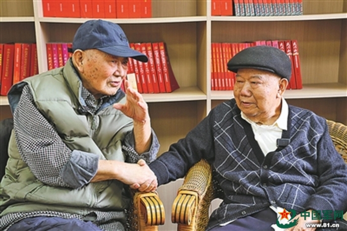 抗美援朝老兵宋英(左)和雷玺(右)共同回忆当年的岁月。秦 美摄